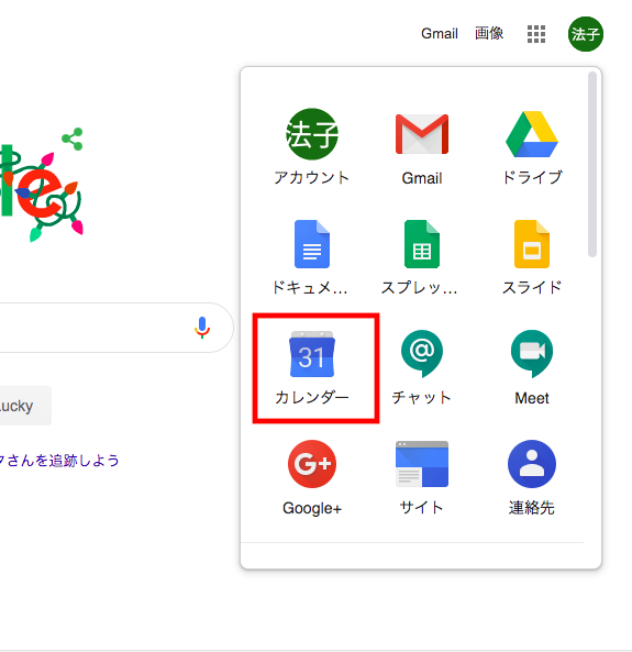 1.Googleアカウントにログインした状態で、右上のメニューから「カレンダー」を選択