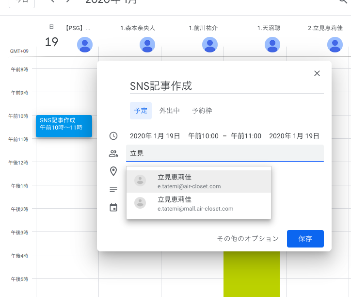 社員から依頼のある業務は、社員が予定を登録するので登録不要です。個人の範囲での予定を登録してください。
