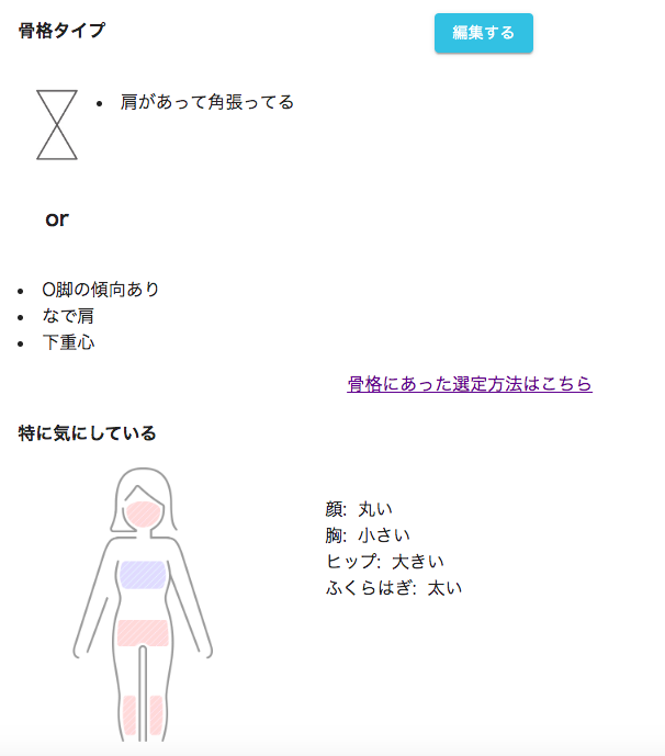 下の「特に気にしている」は「1.ご自身からの申告情報」で、上の「骨格タイプ」は「2.登録内容を元にした参考情報(3サイズおよび写真からの推測)」です。