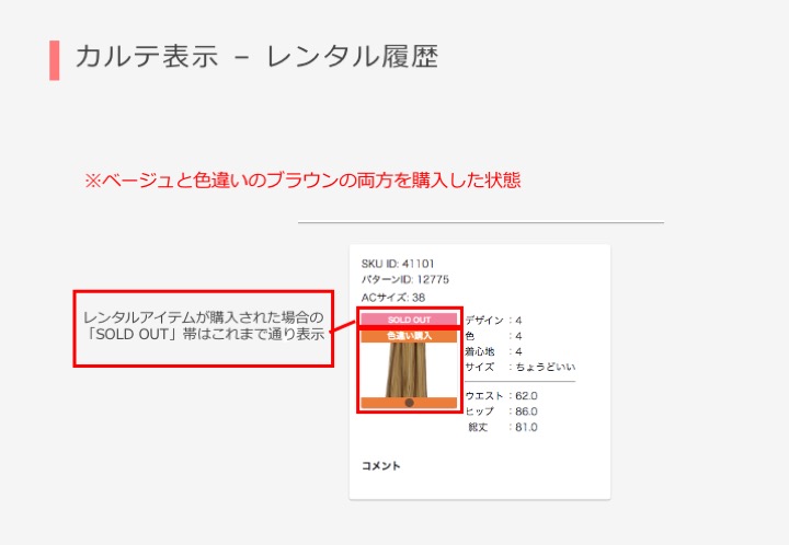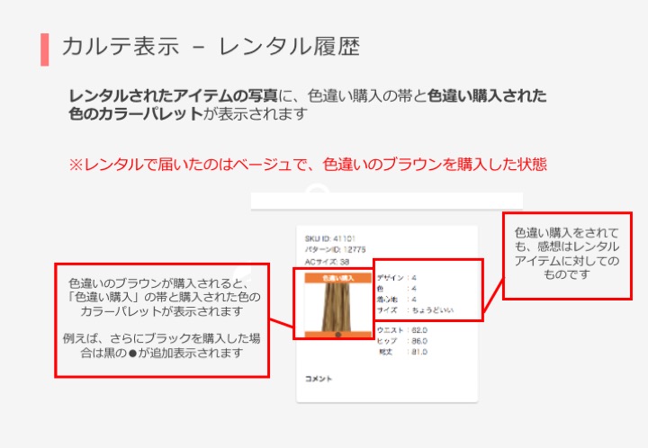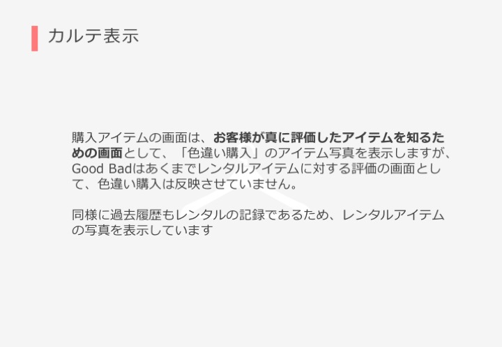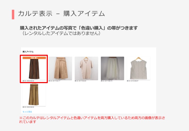 カルテにおいては、「購入アイテム」「GoodBad」「レンタル履歴」に「色違い購入」の帯がついて表示されるようになります。