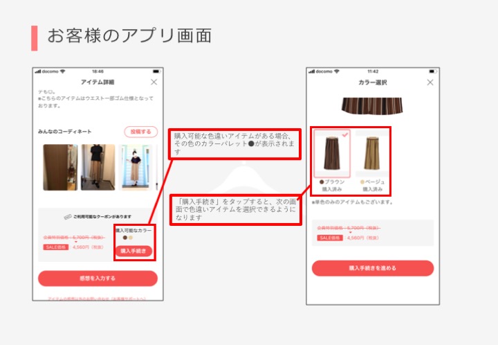お客様側の機能改修で、色違いアイテムが購入できるようになりました!