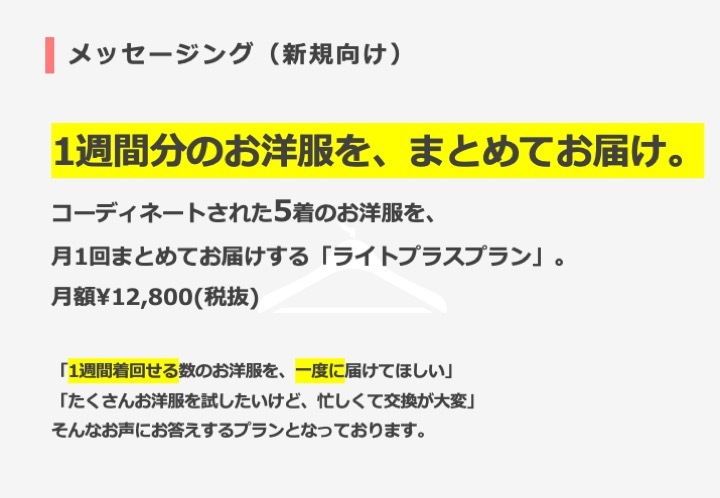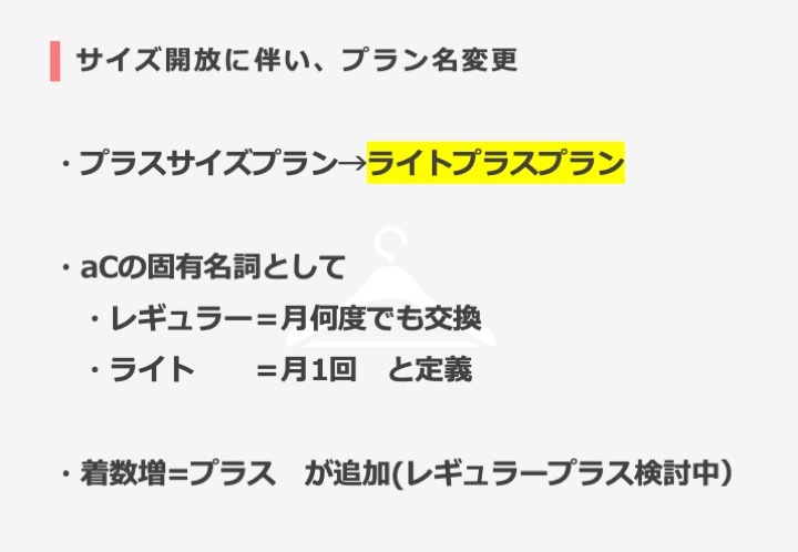 現在、プラスサイズプランのみ5着をお届けしていますが、その5着お届けをXS〜3Lまで拡大するというものです。選定方法及び報酬は従来のプラスサイズプランと何も変わりません。詳しくは資料をご確認ください。