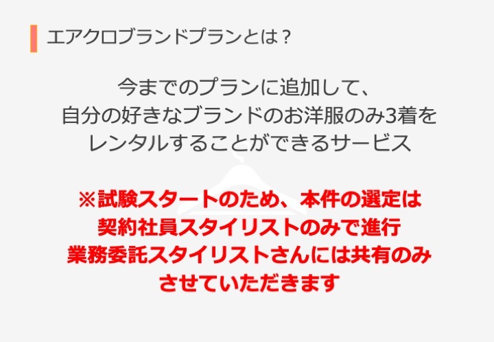 またもうひとつ、こちらは業務委託スタイリストさんが選定を行うものではありませんが、エアクロの新しい取り組みとして特定のブランドのアイテムのみをお届けする「ブランドコラボプラン」もスタートしますので、併せてご覧ください。