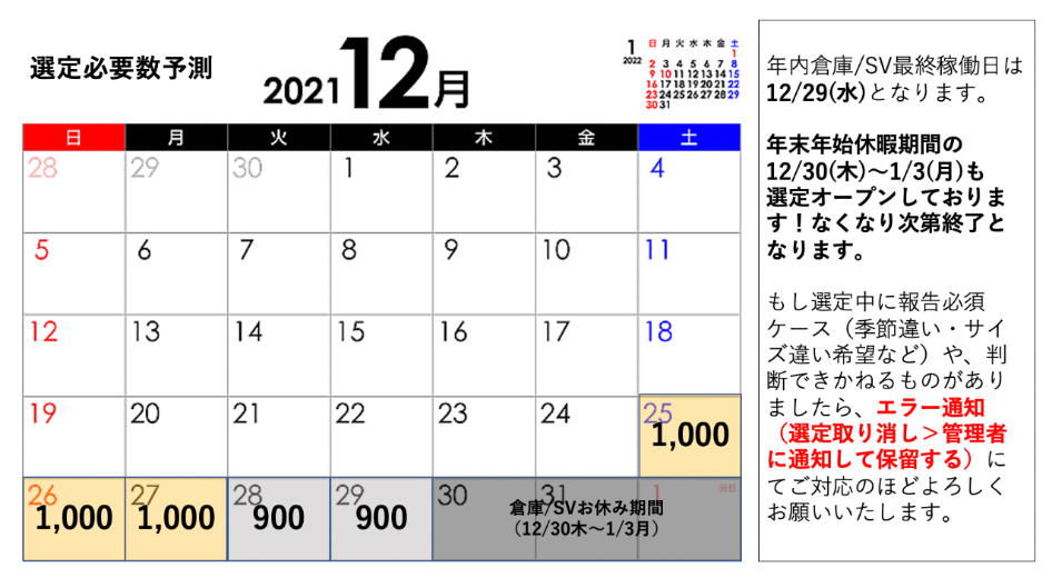 もし、2021/12/30(木)〜2022/1/3(月)のあいだ、選定いただいている際に、