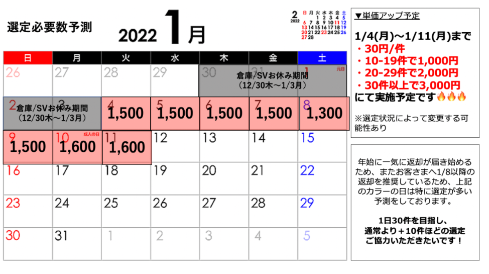 1/4(月)〜1/11(月)まで、最大の単価アップウィークを開催したいと思います!