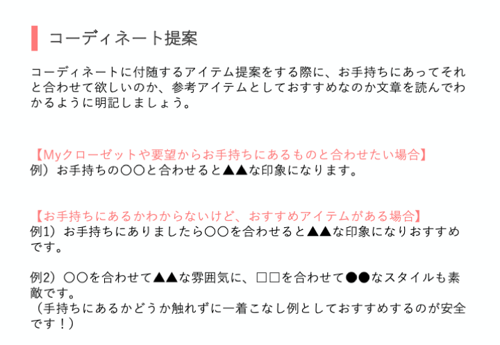 最近、お客様の手持ちにないアイテムに対し「お手持ちの〇〇と合わせると〜」とスタイリングコメントを書いてしまい、CSにクレームが入るということが増えております。下記の資料を参考にしていただき、言い回しに気をつけていただくようお願いします。