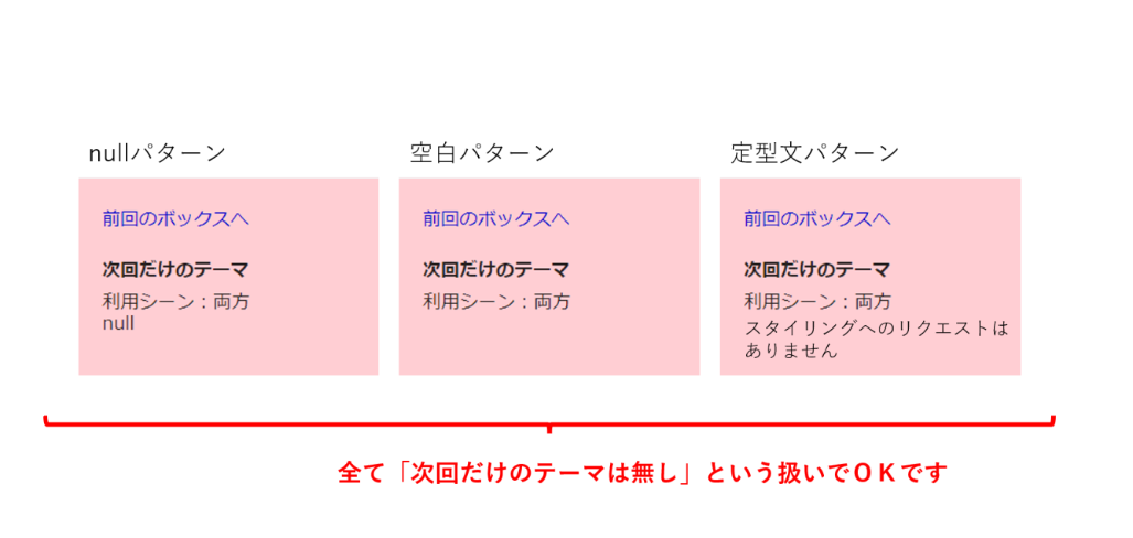 お客様が次回だけのテーマを特に入力していないとき、添付の画像の通りの3通りの見え方があります。