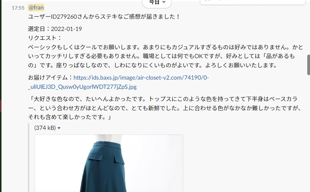 お客様からのご感想のうち、特にテンションを高く書いてくれているもの&デザインやカラーの評価も最高のものが出た場合、NotificationBotというbotからslackで配信されるようになります選定の前に「喜びの声」を見てもらっていますが、1回見てしまったら消えてしまうのと、色々なコメントが混ざっていて見にくい、という声もいただき、特によかったものをより抜きで&見返せる場に、実験的に配信することにしました。