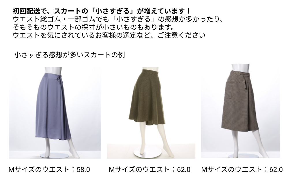 2/25 スカートの「小さすぎる」が増えています、総ゴムでもウエストがきついことがあるようです
