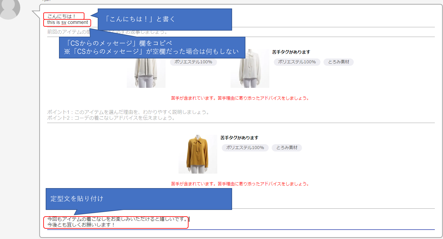③冒頭文に「CSからのメッセージ」をペーストしたあと、一番最初に「こんにちは!」を足す