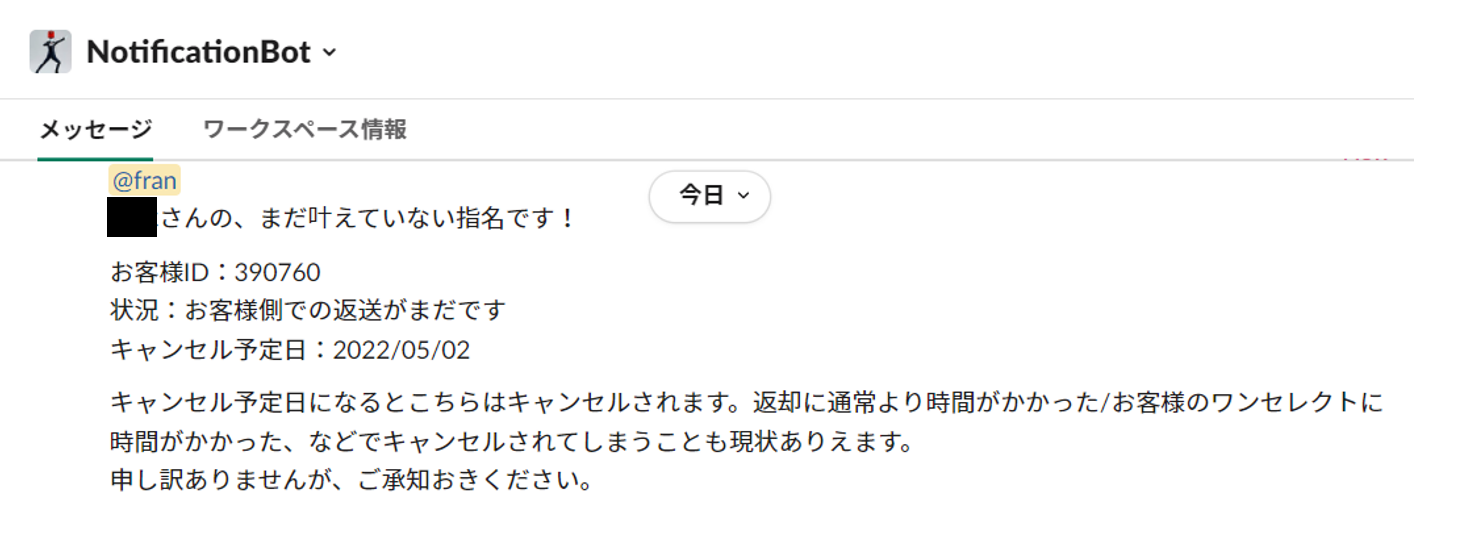 そこで、平日、添付画像のようなbotで、指名を受けているスタイリストの方には「今この人の指名はこういう状況だよ」を発信しようかと思いますもう一種類、今までの指名通知botもあるのでややこしく感じるかもしれませんが、こちらもご確認いただければ!