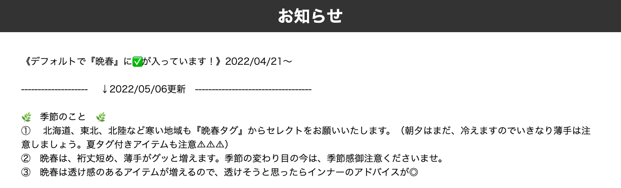 ※ブランドセレクト選定のアイテムバリエーションには影響ありません。ご不明点等あれば、スタイリングチームや私shuriまでご遠慮なくご連絡ください。