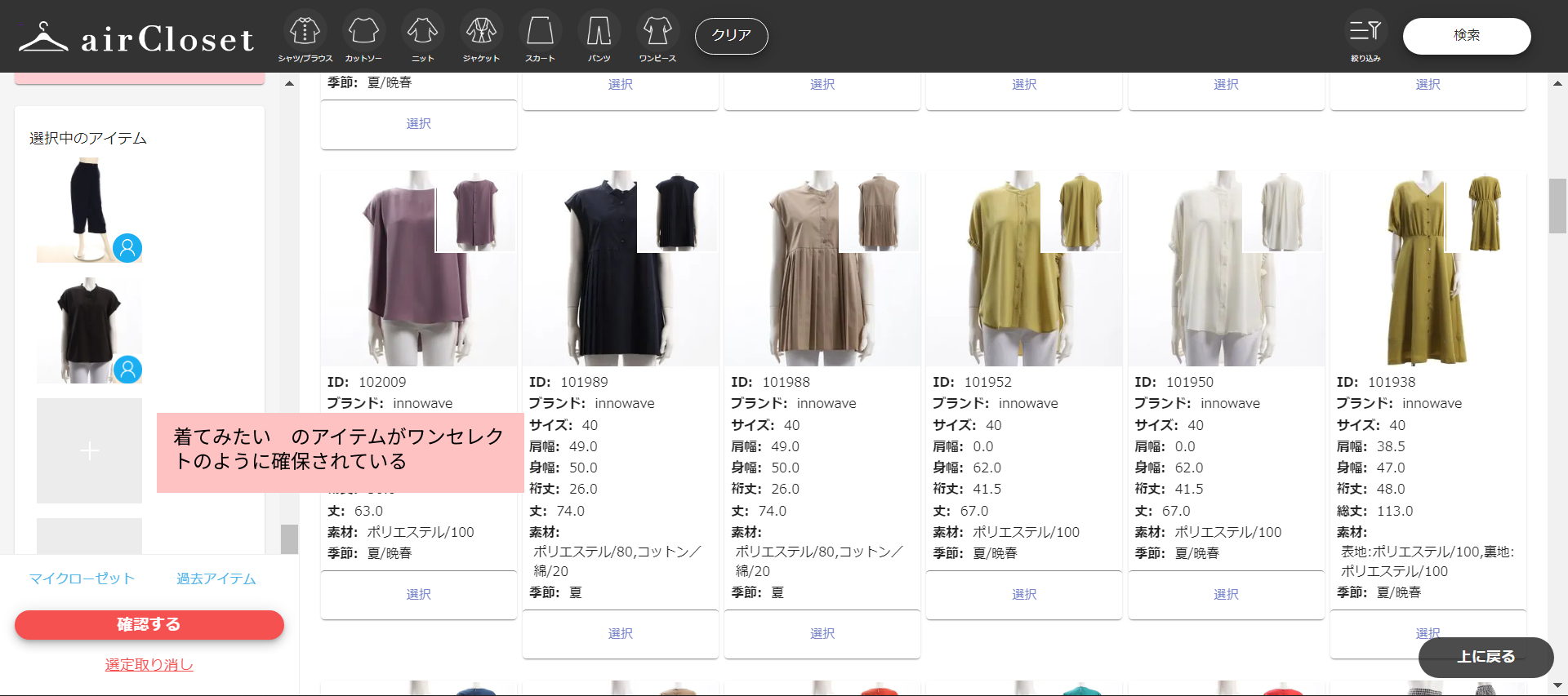 ※すべてのお客様ではなく、約半分のお客様で、「着てみたい」確保機能が効いています初回選定チェンジ中に、「着てみたい」がワンセレクトのように確保されているお客様に引きあたった場合、確保されたアイテムはそのまま使いつつ選定を進めてください