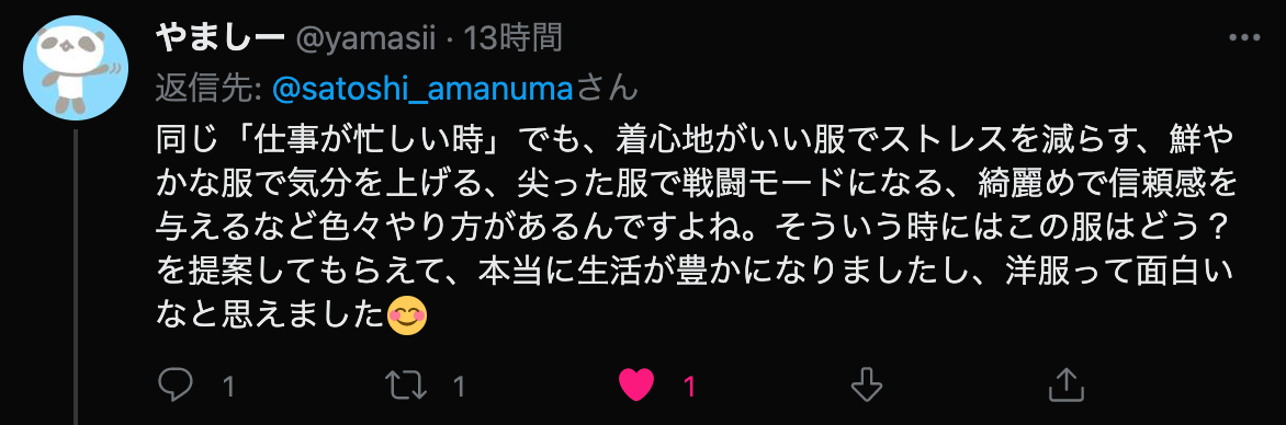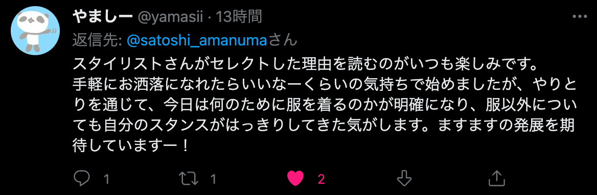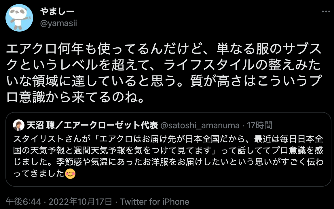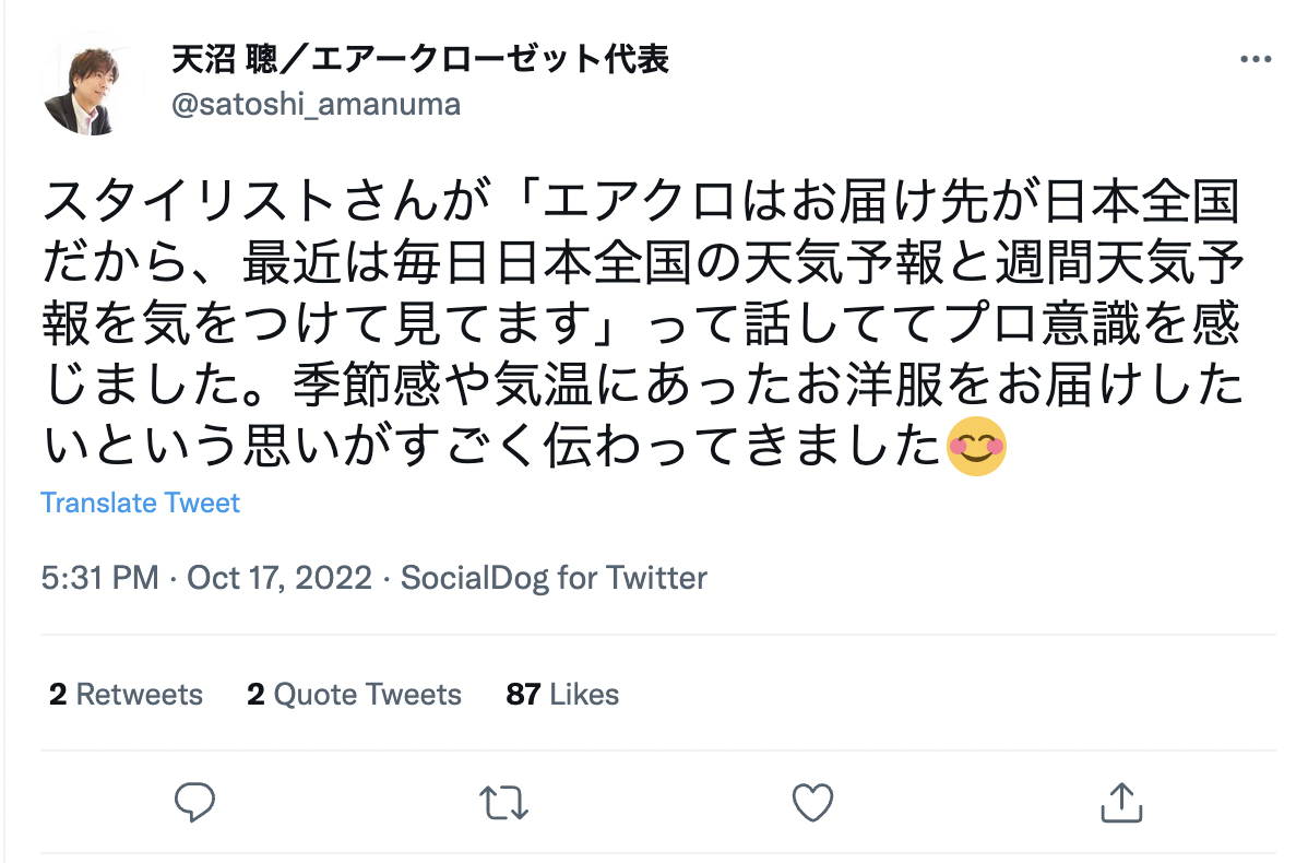 受賞スタイリストさんからのコメントで「全国の天気予報の確認を欠かさないようにしています。」ということに感銘を受けて弊社代表天沼がTwitterに投稿をしてくれました!