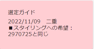 こちらが二重選定なので、記載のガイドに従って選定願いますたとえば■スタイリングへの希望:2970725と同じ とあったら、お客様のカルテ内の、ボックスNo: 2970725と同じ要望が出ているものとしてご理解くださいどうぞよろしくお願いいたします!なお、汚損についてお客様サポートからお詫びしたうえで二重選定を手配しているので、前回のご感想に汚損のことがあってもslack報告不要です