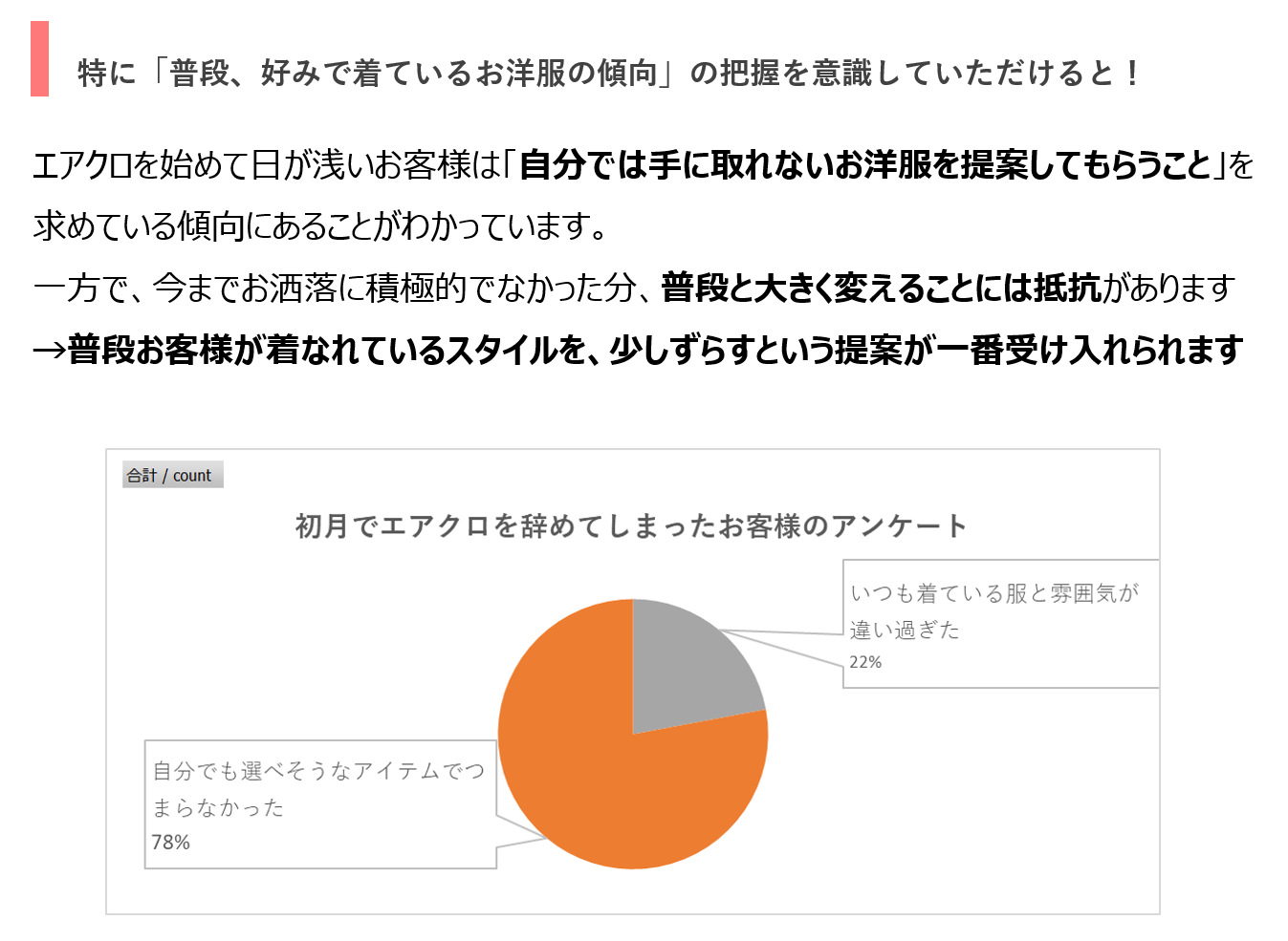 アンケートによると、エアクロを始めたてのお客様が多く感じるネガティブ感情は「これなら自分でも選べそう」「地味・無難」のようです。