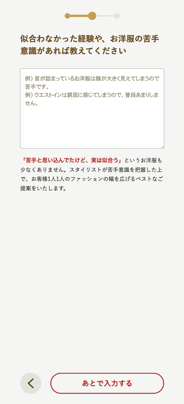 こちら、「新しいお洋服にチャレンジしたいの?それともあまりチャレンジはしたくないの?」など、スタイリングの方向性を決める上での参考として使ってもらうものです。 コーデの選定理由を書く際などにも、ぜひお客様のご期待にも触れていただけると「スタイリストさんい私の期待をくみ取ってもらえた!」という点で、お客様の満足や感動につながるものと思われます。