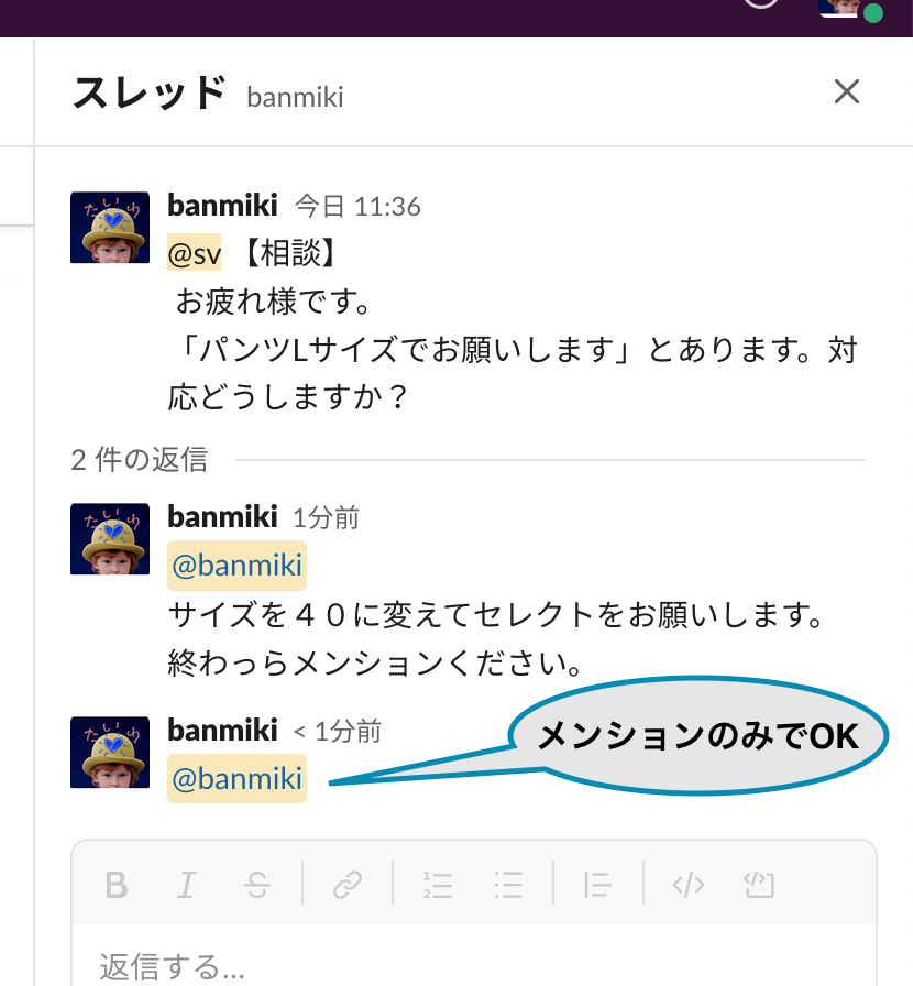 3、選定が終わったら、そのスレッドに@〇〇(担当SV)のみメンションを送るご不明な点はご相談くださいませ。