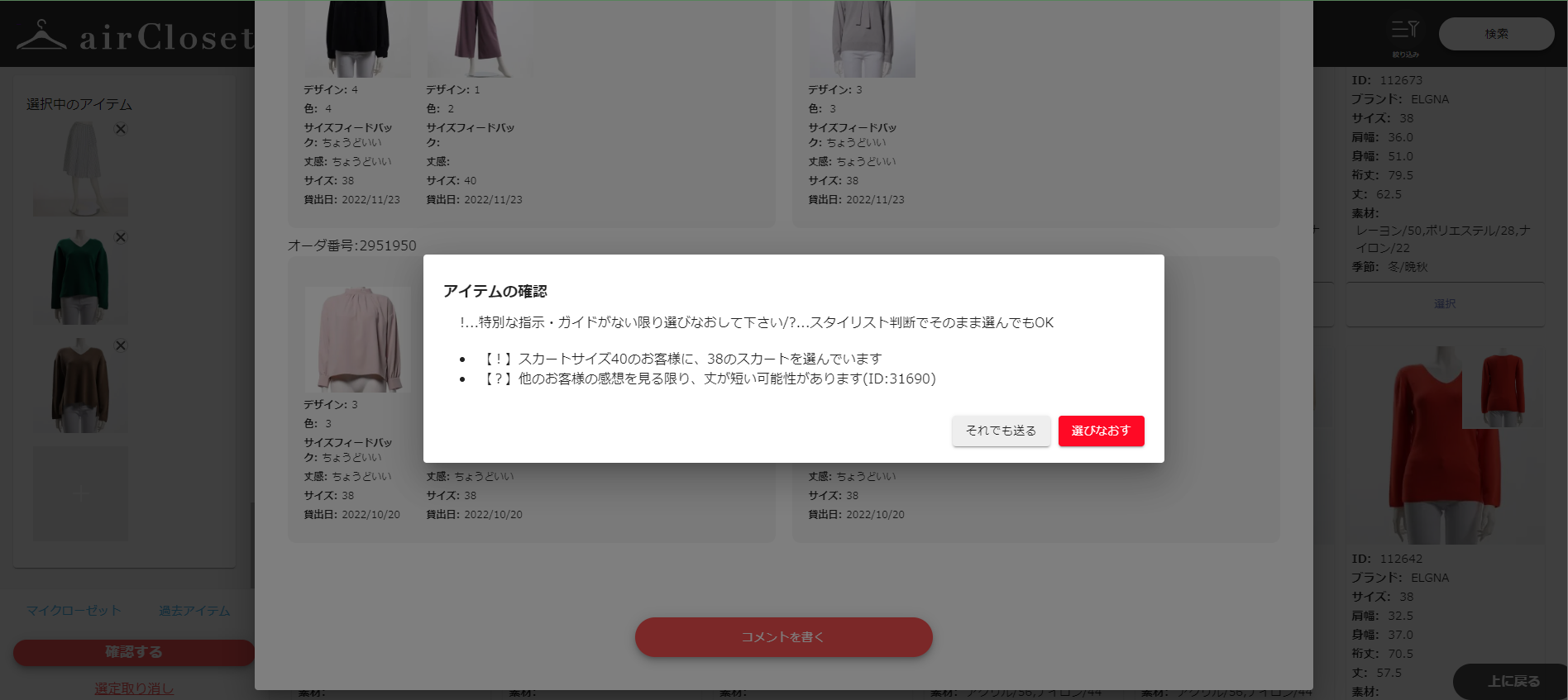 165cmのお客様のスタイリングをしている際に、162cmや161cmなどのお客様から「短い」と多く言われているスカートを選んでいた場合、「このスカートは短いかもしれない」とポップアップを出す機能です。