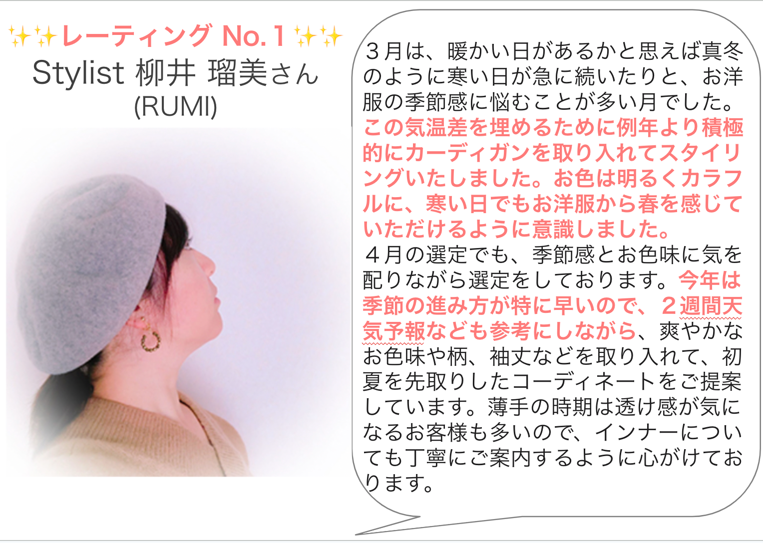 今回より、No.1受賞のスタイリストさんは普段スタイリストプロフィールでお客様へお見せしているお名前を( )内に記載をしております!
