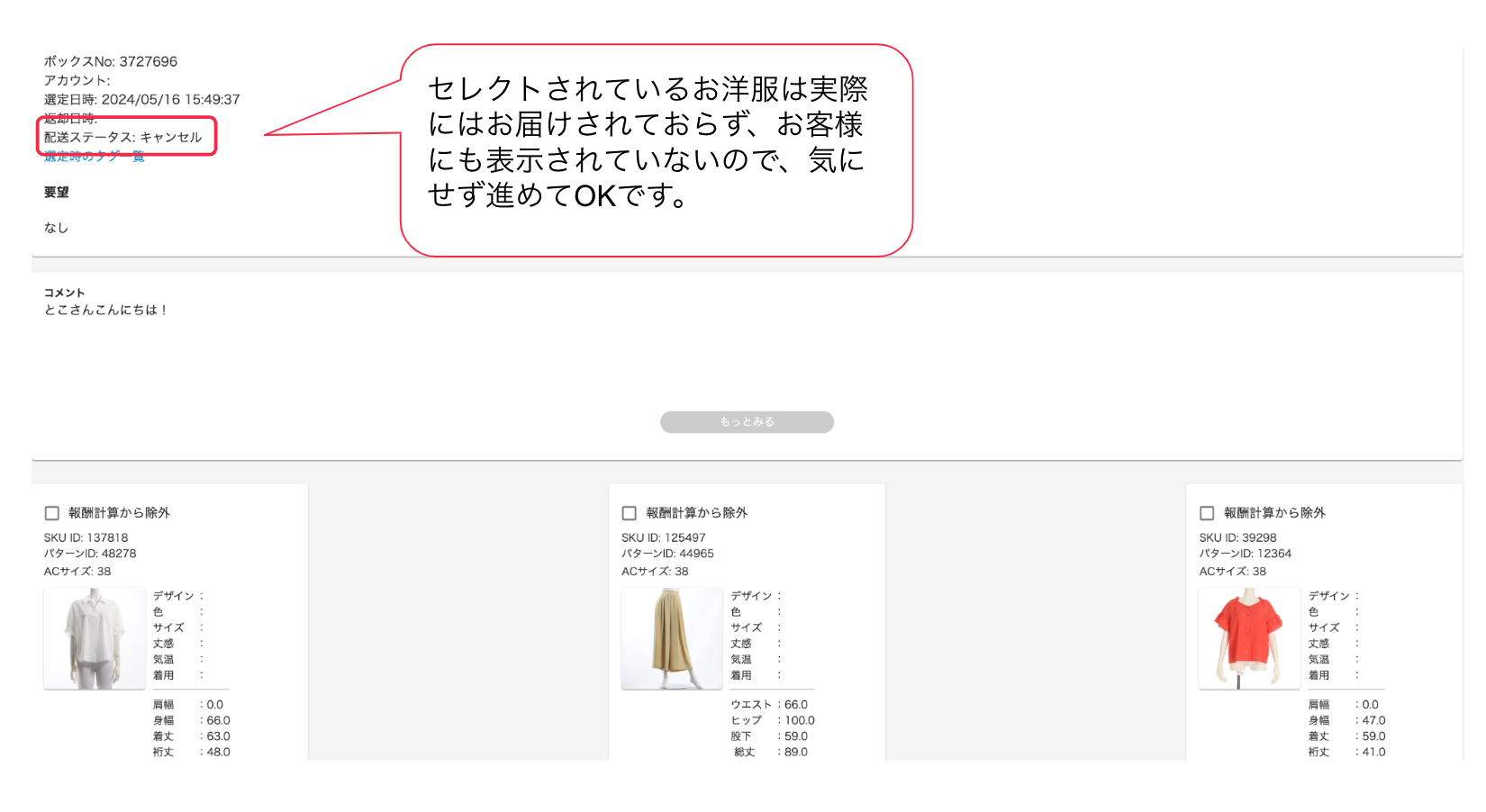 その際、実際にお洋服は送られていないので、気にせず通常通りの選定をしてください。
