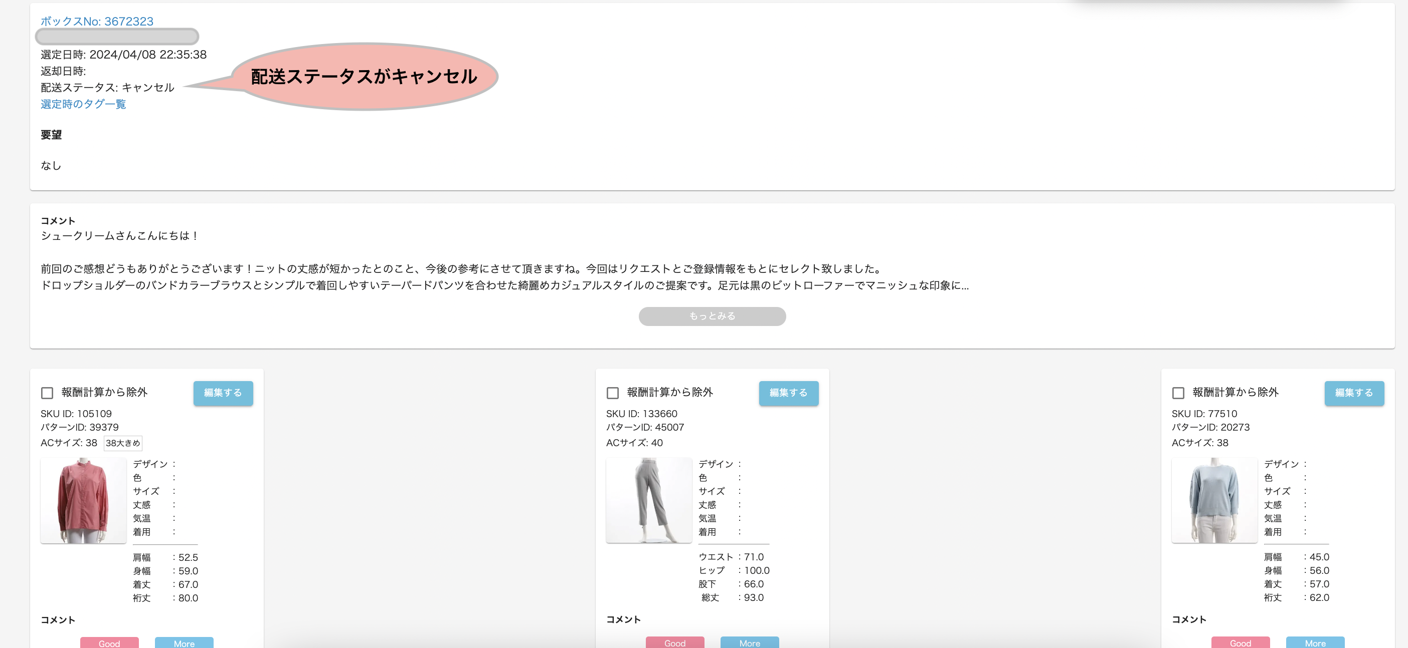 システムや倉庫起因などで配送ができないケースとなっております。例えば、スタイリストの皆さんがセレクトしたアイテムは、倉庫でピッキングされ、検品をします。