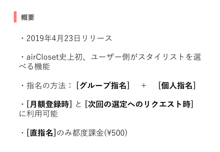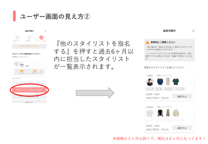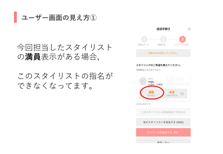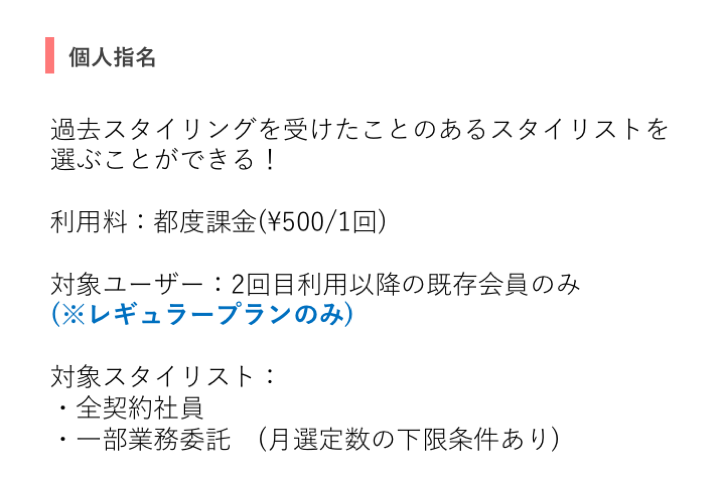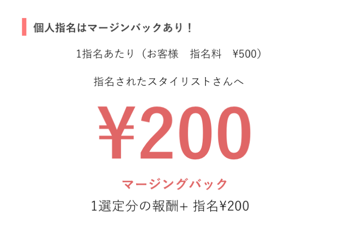 スタイリスト指名・サービス *現在はプラン・オプション全て対象になっています。(2023/08/08) ●個人指名のスタート時期 *直接お客様から指名をいただく場合は、スタイリストデビューして、3ヶ月経ったらとなります。3ヶ月経っても連絡がない場合はSVまでご相談くださいませ。 スタイリスト指名