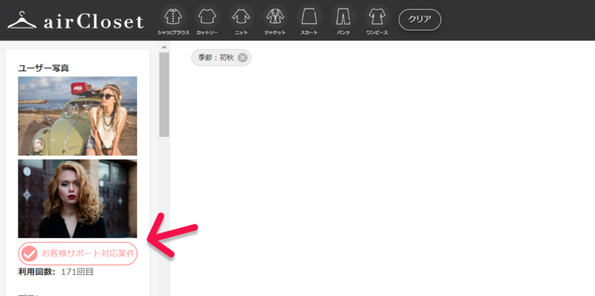 エアクロのお客様サポートがお客様とお電話で話しながら、サービスのご不明点のお伺い・感想欄の入力や次回リクエストの書き方などをサポートした案件になります。通常の選定と比べてスタイリング上、特に気にすることはないので、感想やリクエストを見ながら通常通りのスタイリングをお願いします