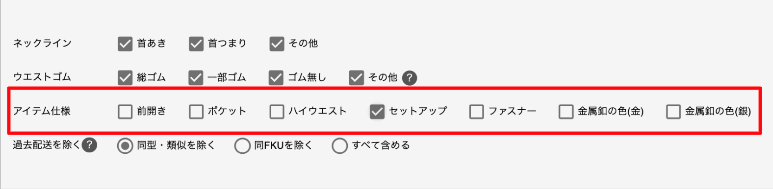 検索するとセットアップになるアイテムが全て引っ掛かりますので、