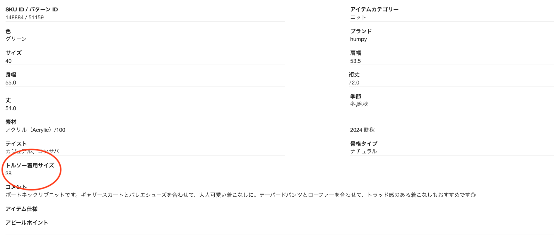 <<アイテム詳細でトルソーの着用サイズがわかります>>