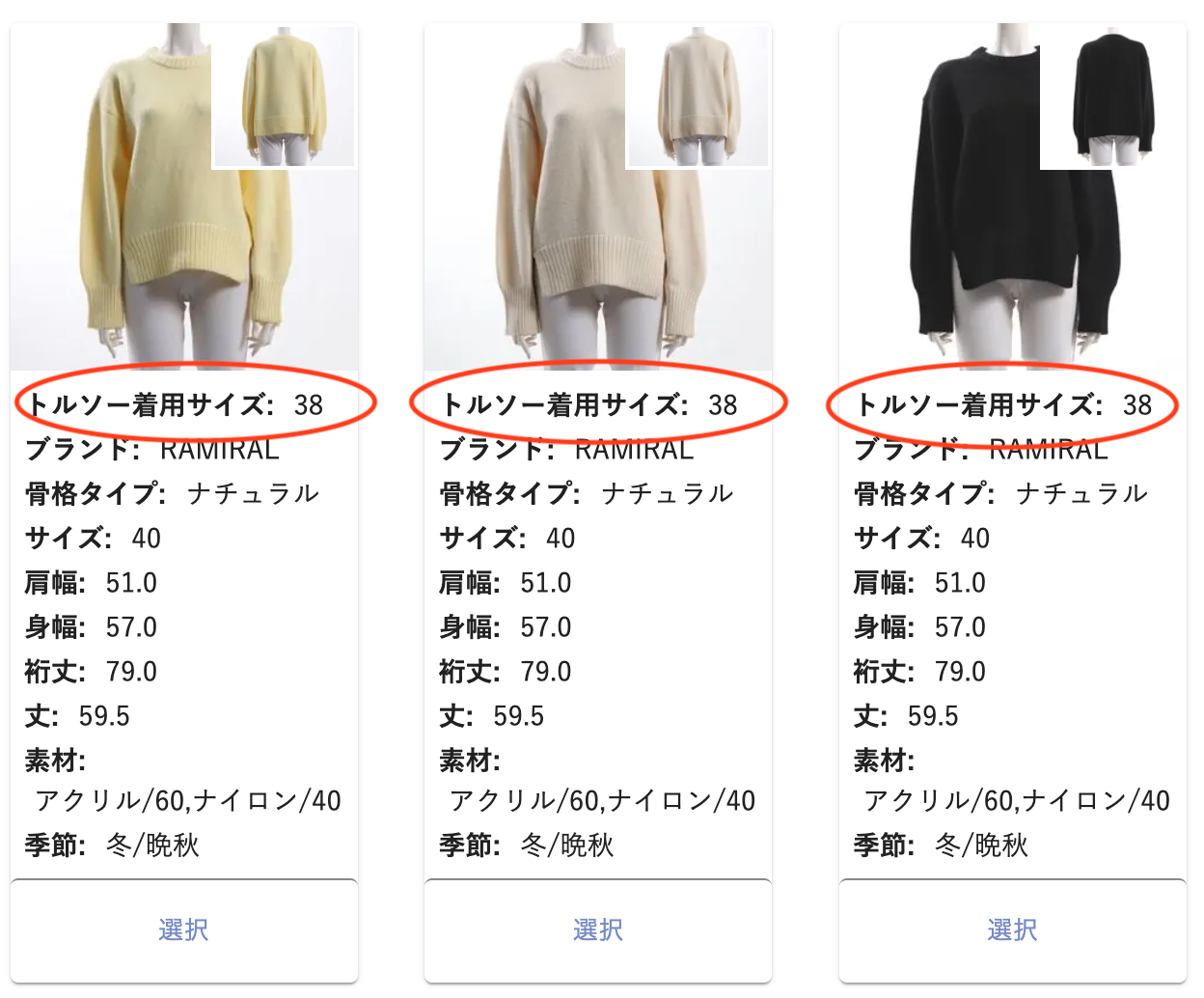 <<選定画面でトルソーの着用サイズがわかります>>