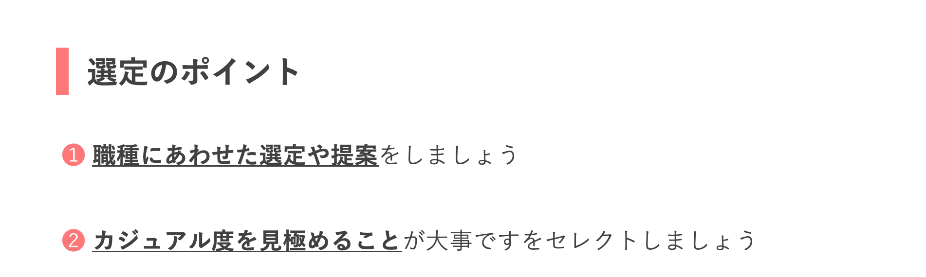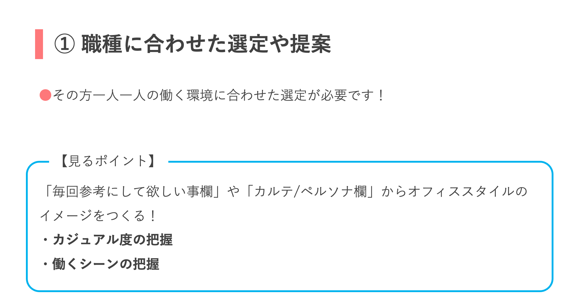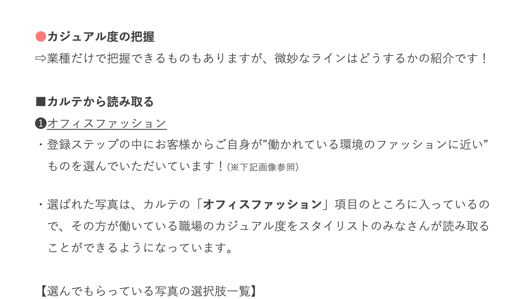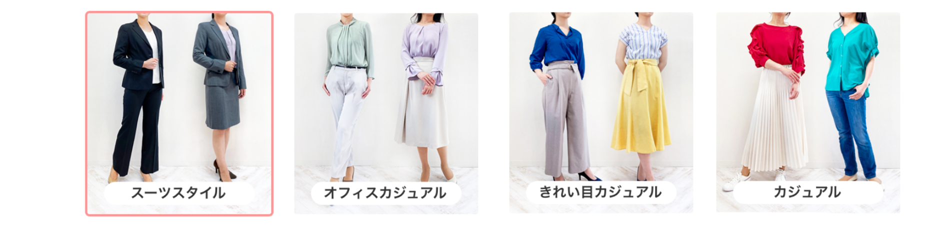 【オフィススタイル】選定ポイント ===============具体的に見ていきましょう!=============== *注意 2022/8月より 『綺麗目カジュアル』の項目がなくなりました。現在は、スーツ・オフィスカジュアル・カジュアルの3タイプです。