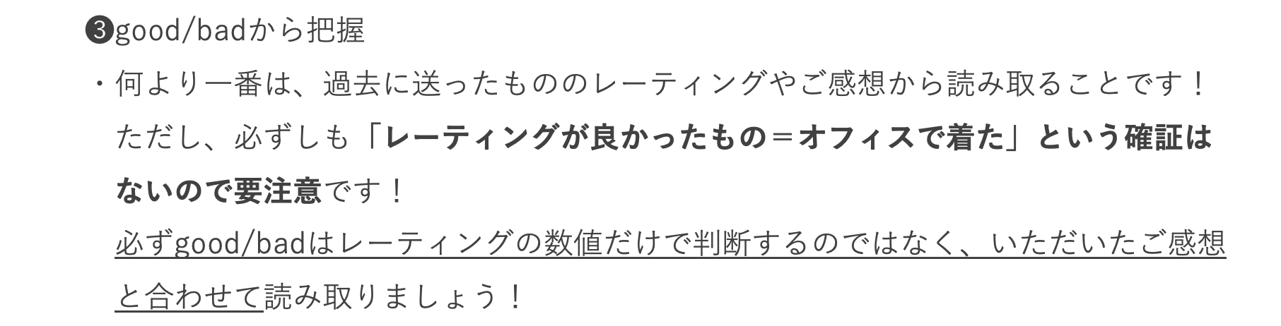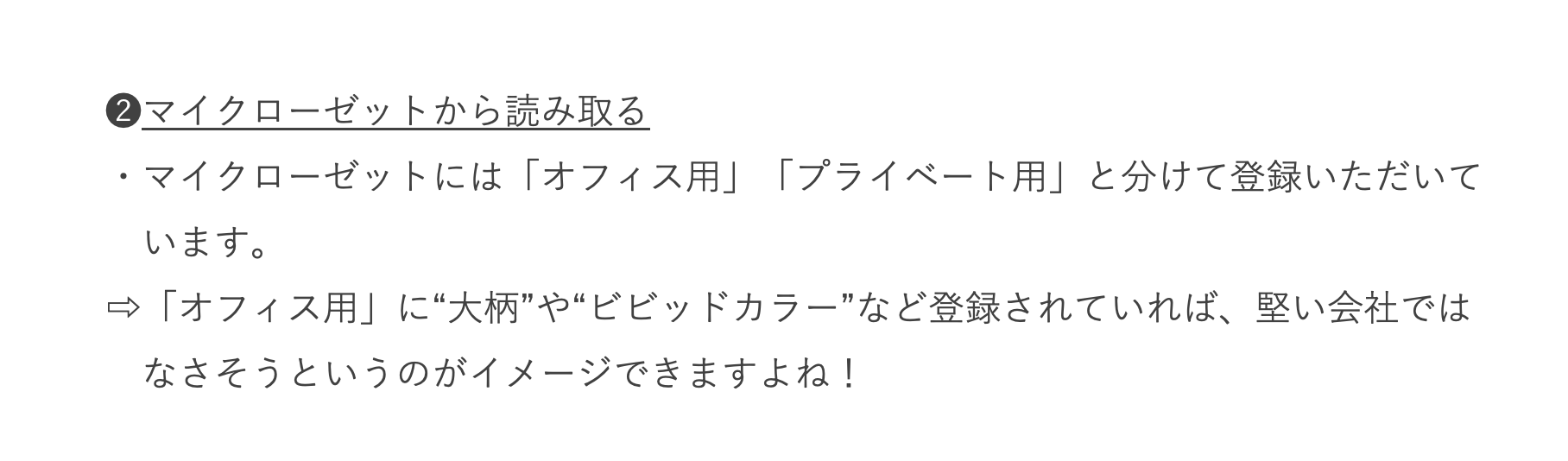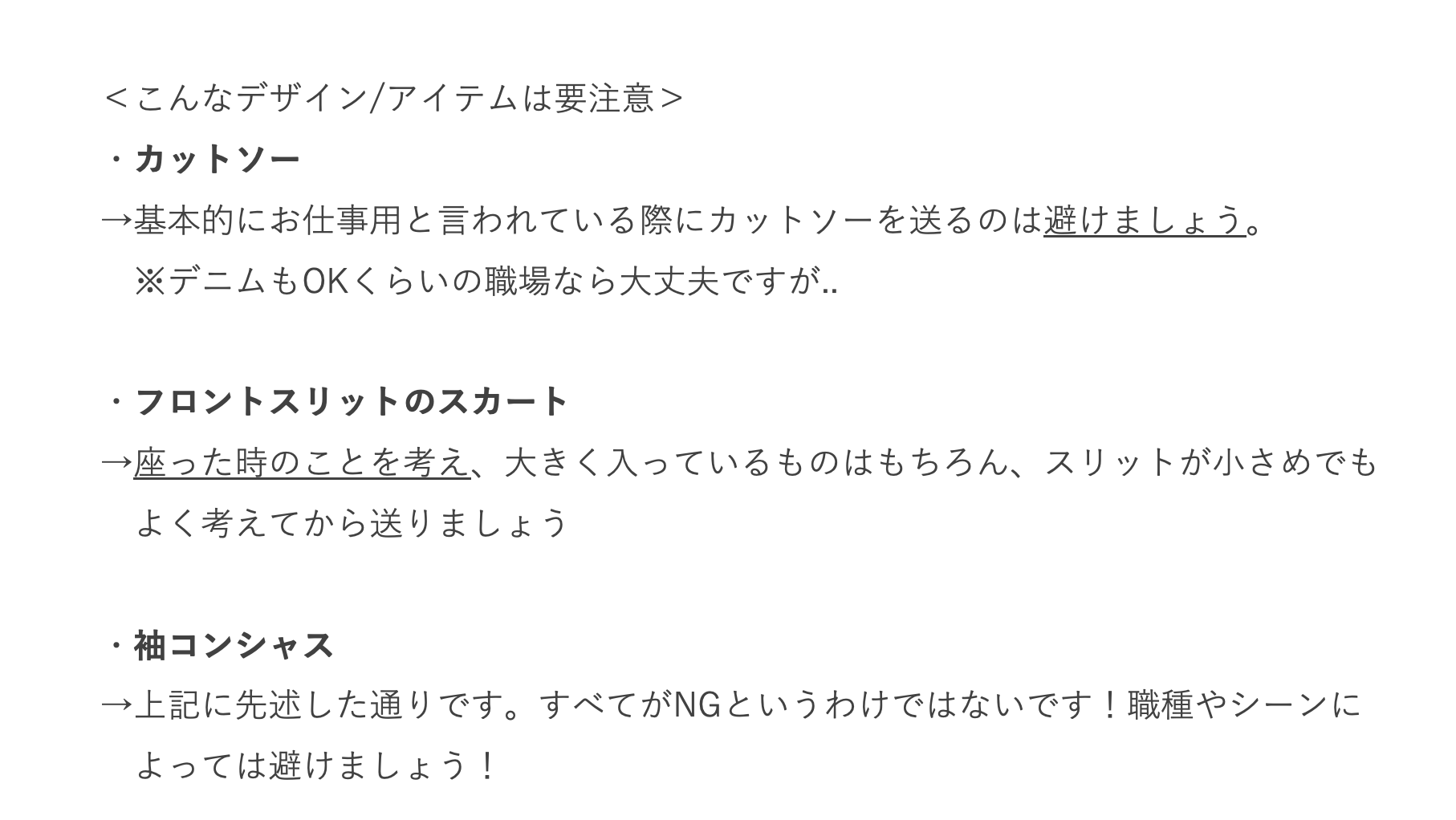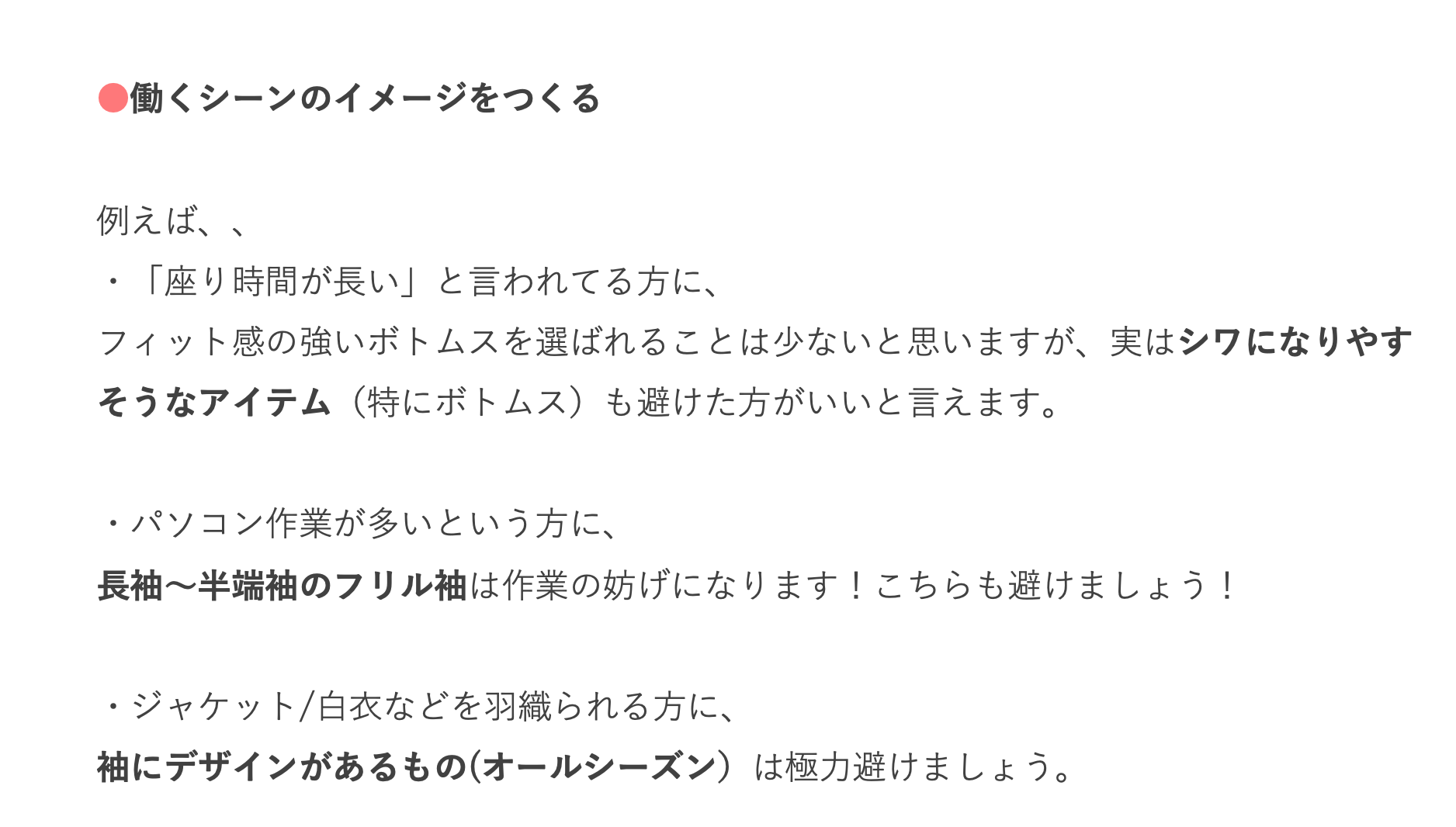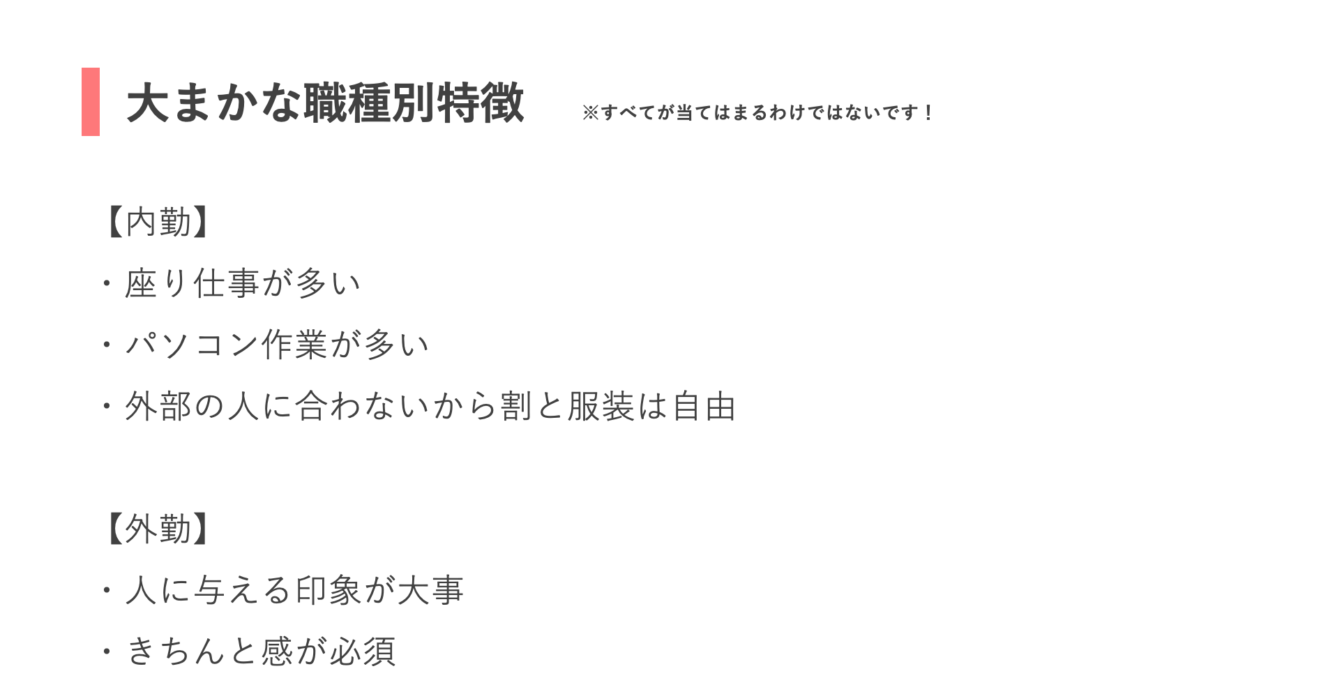 【オフィススタイル】選定ポイント ===============具体的に見ていきましょう!=============== *注意 2022/8月より 『綺麗目カジュアル』の項目がなくなりました。現在は、スーツ・オフィスカジュアル・カジュアルの3タイプです。