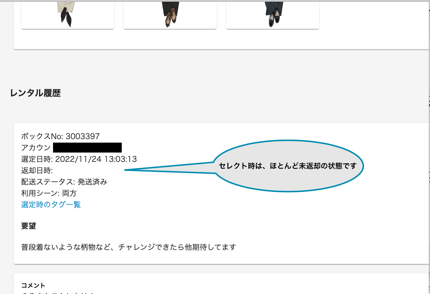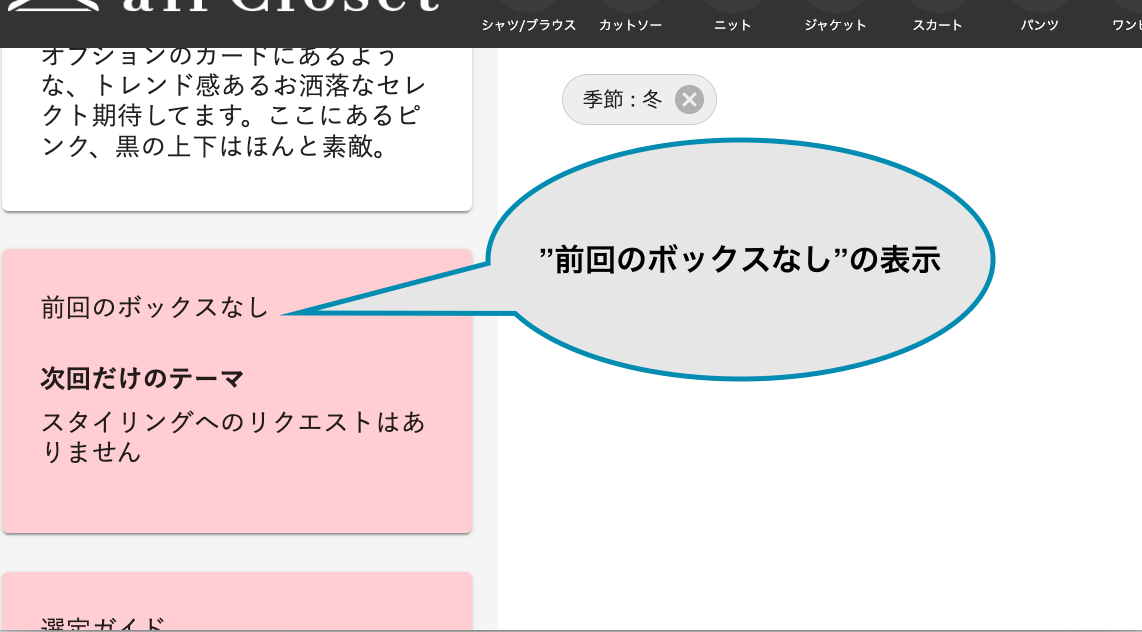 「前回はアイテムのご感想や利用シーンを書かれていなかったようですが、お感じいかがでしたでしょうか? セレクトするときにいかしていきますので、これからいろいろ教えてくださいね!」