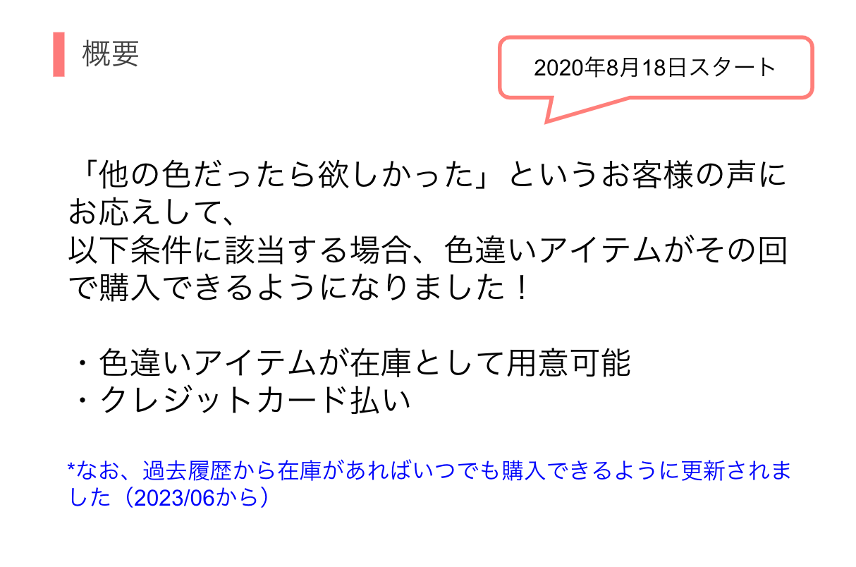 2023年7月より、過去のアイテムの色違いが(在庫があればになりますが)いつでも購入できるようになりました。
