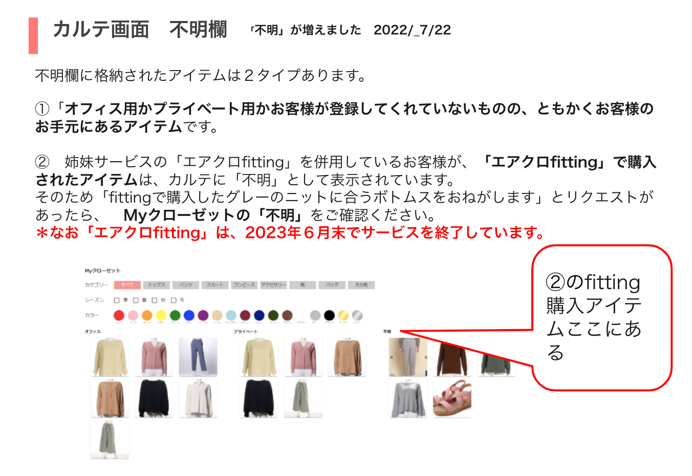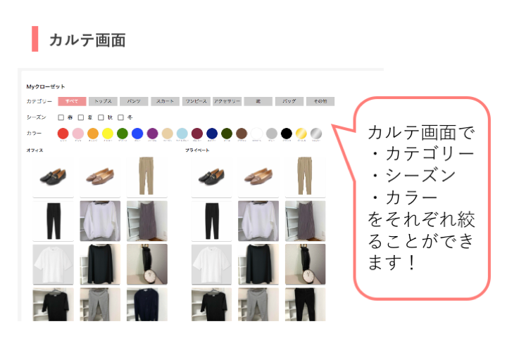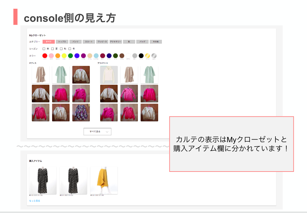 ※カルテver.2の場合は、お客様側の画面と同様に、購入アイテムもMyクローゼットに含まれています!
