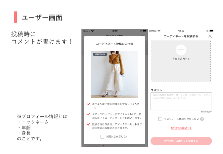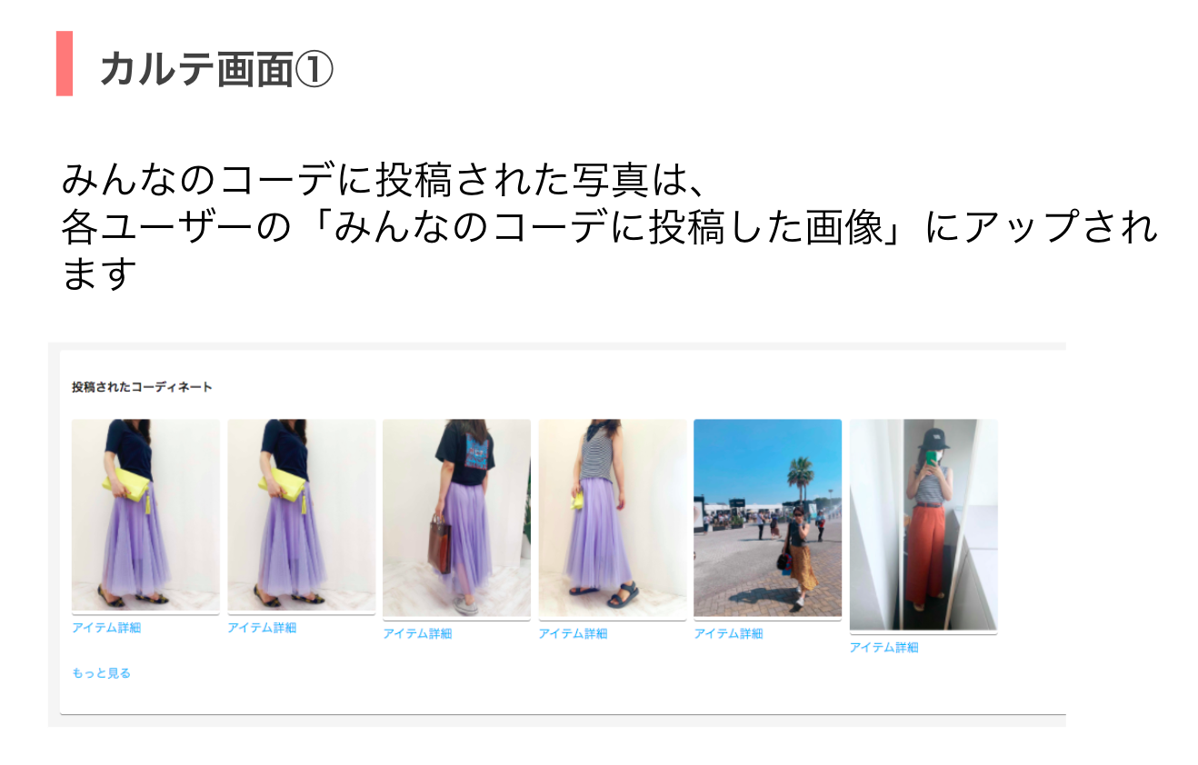 アイテムの着用画像もみんなのコーデに投稿があると活用されます。アイテムのサイズ感や着こなしのイメージを掴むことができます