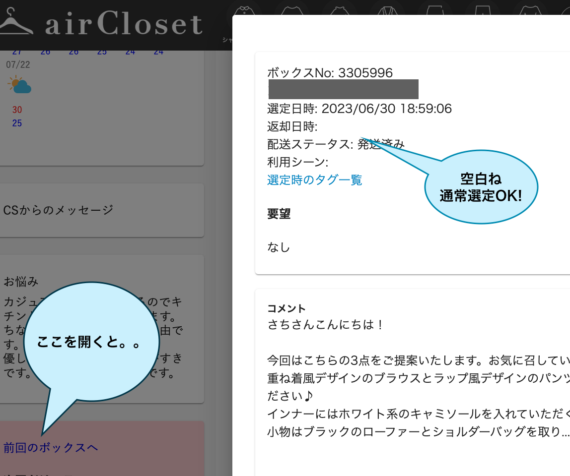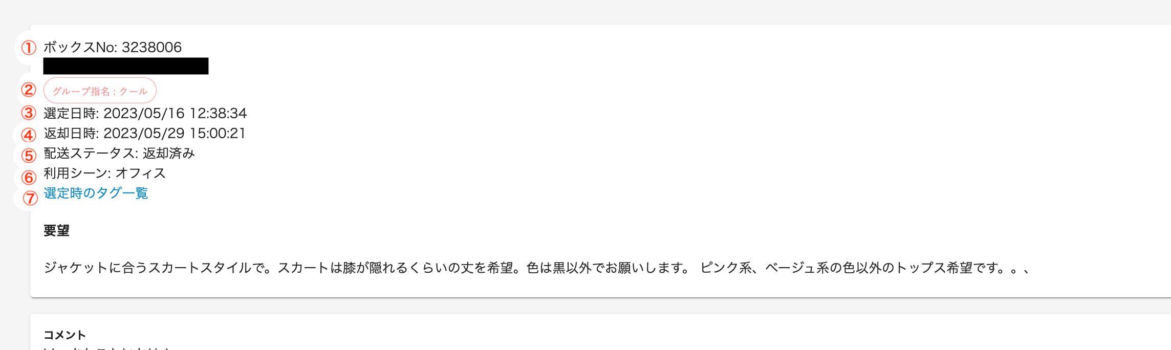お客様と共有しているパッケージのナンバーです。 ここではボックスナンバーと表示されています。(airClosetの初期の頃はboxでお届けしていた歴史があり、その名残りです)レンタルナンバーは、good /bad(過去アイテム)機能で検索ができます。