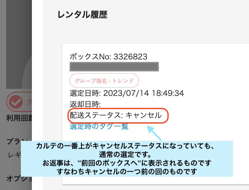 ❷ カルテを見ると、返却日時は空白でなおかつ、配送ステータスがキャンセルと表示されてることがあります。これは、倉庫で配送準備時に該当のアイテムに汚損などが見つかり、そのパッケージが送れないケースです。